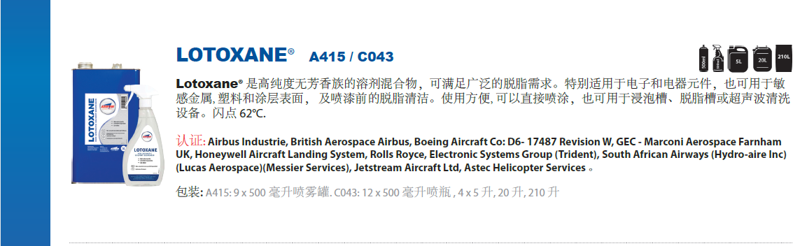 英國(guó)ARROW公司生產(chǎn)的安全清洗劑 LOTOXANE是一種高科技產(chǎn)品,系無(wú)毒、無(wú)色、無(wú)味的高純度清潔劑,用來(lái)替代因含毒性或操作不便等原因而禁止使用的傳統(tǒng)的氯化碳?xì)洹⑷纫彝椤⑷纫蚁┑热軇瑢?zhuān)對(duì)電氣及電子組件進(jìn)行清潔的清洗劑。它也可安全地配合超聲波設(shè)備,作為金屬、特殊金屬、塑料制品及噴涂表面包括氯化橡膠表層的脫脂劑。