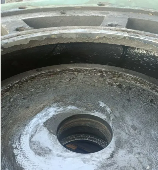 葉輪表面出現(xiàn)凹坑、粗糙度增加,導(dǎo)致過流阻力增大;葉片出現(xiàn)缺口,產(chǎn)生渦流,降低流量和效率;嚴(yán)重時(shí),葉輪會(huì)報(bào)廢,需要更換新的葉輪。