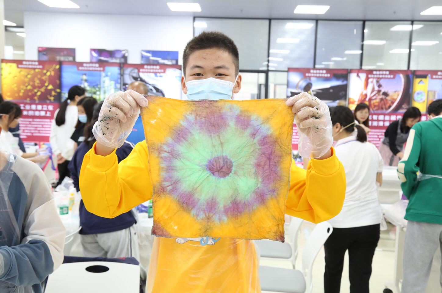 自由創作環節,同學們想法獨到,每一件作品也都樣式不一。過程中,科普老師細致講解、耐心幫助指導。扎好的布料染色的那一刻,同學們表示激動又期待。當一件件各具特色、花樣別致的作品呈現在眼前時,大家紛紛感嘆扎染的精妙。取出作品展示,藍的、紅的、花色條紋,每一件都別出心裁,形成了獨有的一道靚麗風景線。