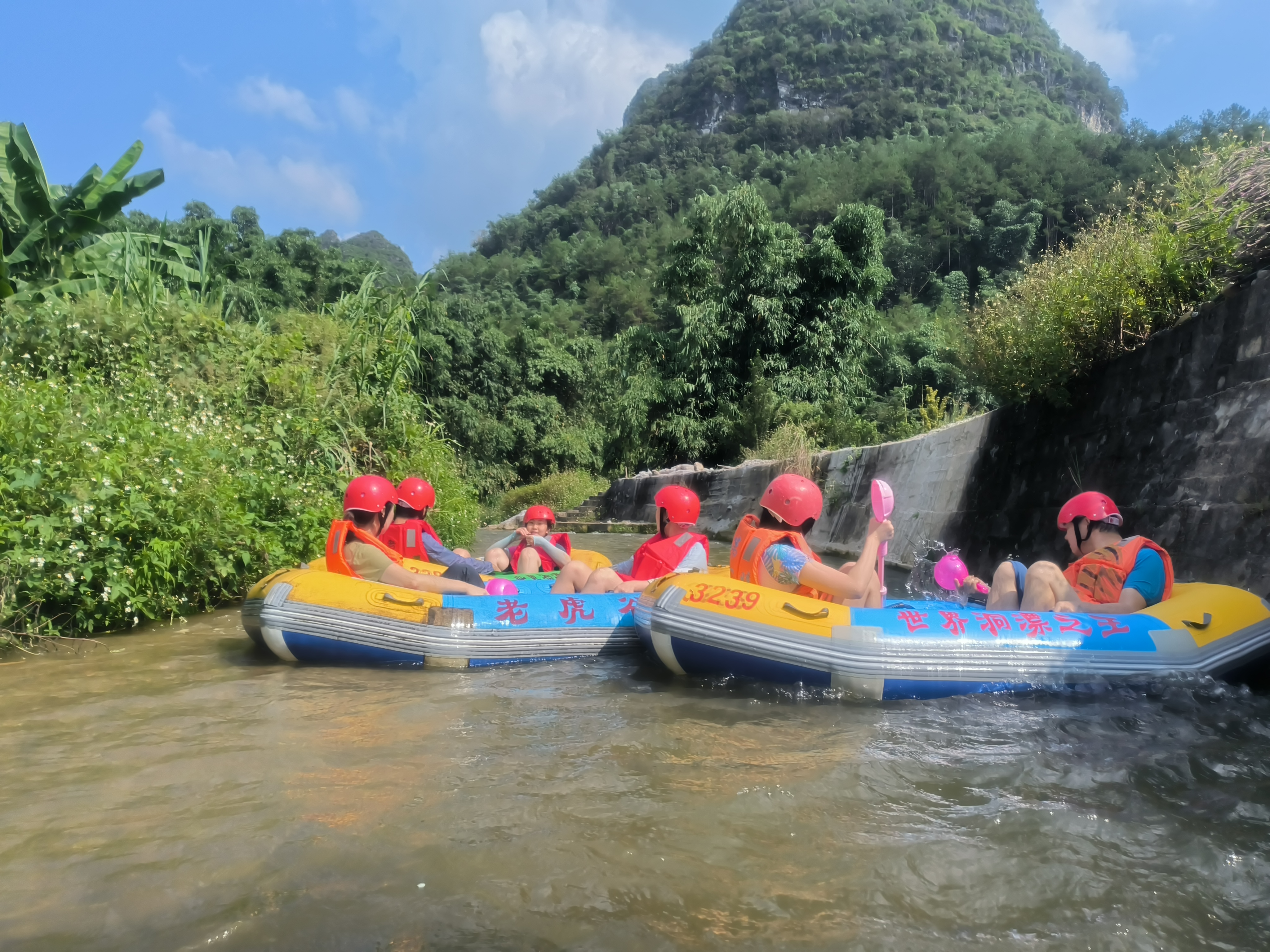 在藍天白云下,在老虎谷的河流中,大家架著小船,孩子們在父母的保護下,在時而湍急時而平緩的河水流中順流而下,在大自然的懷中演繹精彩的瞬間,感受滿滿的清爽與激情。