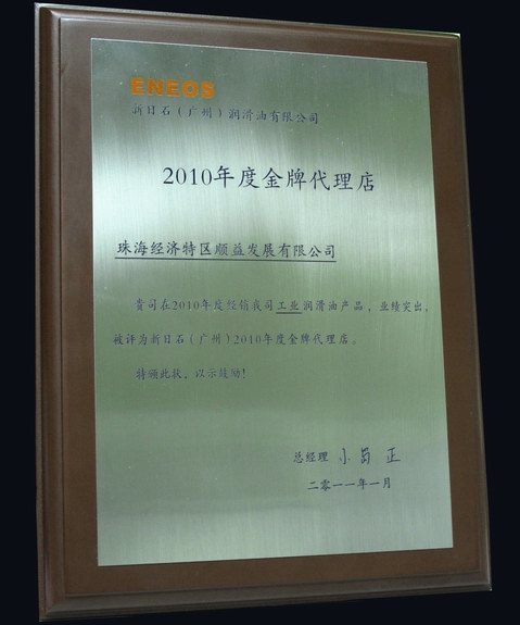 因2010年度,珠海經濟特區順益發展有限公司在新日本石油節能潤滑項目中所做出的杰出,吉昆日礦。)授予珠海經濟特區順益發展有限公司為“2010年度金牌代理店”獎。